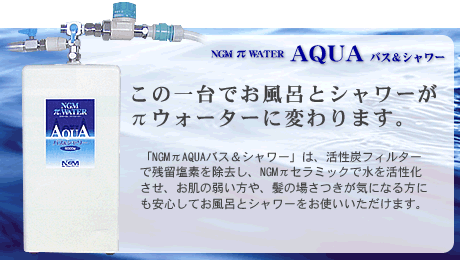 ISO9001を取得 「信頼される水づくり」に取り組んで24年、家庭用・業務用浄水器メーカー潟Gヌジーエムが製造販売している水質活性化装置「πウォーター」は、安全でよりおいしい水をつくる高性能浄水器として好評を得ています。 水にこだわる消費者のニーズに合った製品を提供するためにエヌジーエムが開発した浄水器は、飲食・理美容・医療・農業・食材加工・水産業・ホテル・戸建て住居・マンションなどさまざまな分野・業種に設置され、性能を発揮し続けています。 この間1998年には国内πウォーターメーカーとして初の「品質保証国際規格ISO9001」をいち早く認証取得。これは、設計・開発・製造及び付帯サービス・品質システムの世界的評価基準をクリアした企業だけが取得できるものです。 21世紀に入ってますます国際化が急ピッチに進む中、エヌジーエムは海外にも販路を拡大し、中国・韓国・米国・カナダヘの輸出も順調。そして現在も未来も、品質システムの充実を図るため努力を続けていきます。 肌にも髪にもやさしいNGMπウォーター 今、好評発売中の「AQUAバス&シャワー6000型」(実用新案・意匠登録済)は、浴室設置型のπウォーター浄水器。塩素・トリハロメタンー溶解性鉛を除去し、赤ちゃんからお年寄りまで肌の弱い人カユミや肌荒れ、髪のはさつきが気になる人も安心して使えます。 また、風呂とシャワーのワンタッチ切り替え、給湯量の設定カルキ臭の解銭設置費のコスト減など特長もいっぱい。飲料水としても利用可(※カートリッジ交換は3〜4年毎)残留塩素除去総能力600000リットル(一日約300リットル〜400リットルの使用の場合)。